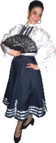 a heavy-weight fabric adorned with ribbons. The blouse is a