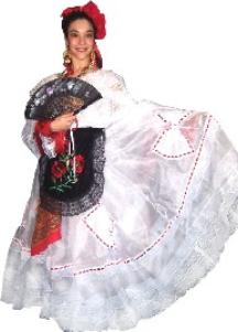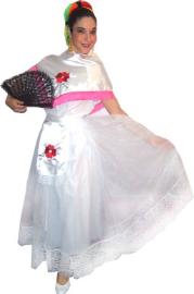 and apron embroidered with flowers, and adorned with hand tied